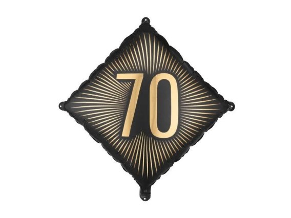 Balon foliowy w kolorze czarnym ze złotym napisem ''70''. Wymiary przed napompowaniem ok. 54 x 54 cm (20 x 20''), wymiary po napompowaniu ok. 46 x 46 cm (18 x 18''). Do napompowania powietrzem i helem. Zestaw zawiera słomkę.