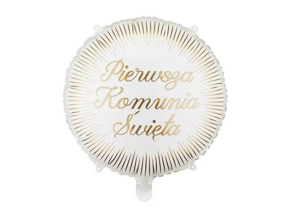 Balon foliowy pastylka Pierwsza komunia święta, w kolorze białym ze złotymi promieniami. Wymiary przed napompowaniem ok. 45 x 45 cm (18 x 18''), wymiary po napompowaniu ok. 35 x 35 cm (14 x 14''). Do napompowania powietrzem i helem. Zestaw zawiera słomkę.