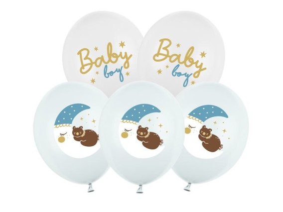 Balony Strong Baby boy z nadrukiem, zestaw zawiera 2 wzory: w kolorze Pastel Light Misty Blue dwustronnym nadrukiem i w kolorze Pastel Pure White z dwustronnym nadrukiem, średnica ok. 30 cm. (1 op. / 6 szt.)