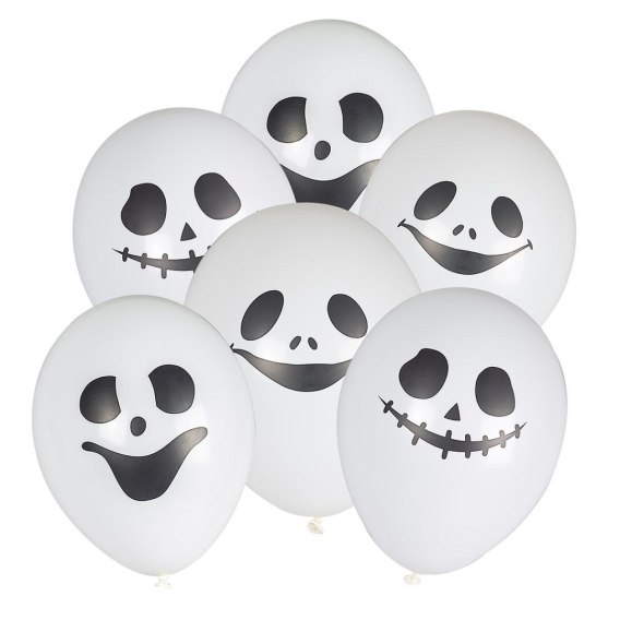Białe balony lateksowe z nadrukiem w kolorze czarnym. Balony stylizowane na zabawne duszki. Doskonałe do dekoracji z okazji Halloween, zabaw i przyjęć tematycznych. Wykonane z naturalnego lateksu kauczukowego. Możliwość nadmuchania helem lub powietrzem. Balony o średnicy 28 cm po napompowaniu. W opakowaniu znajduje się 6 sztuk. Produkt zaprojektowano i wyprodukowano w Polsce.
