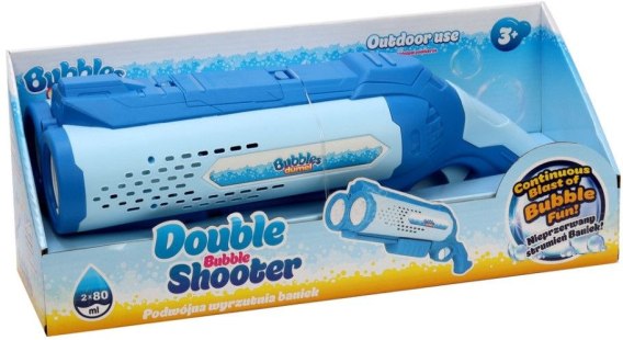 Podwójnie dobra zabawa z dwa razy większą ilością baniek! Wyrzutnia ma aż dwie lufy, a do tego wyposażona jest w światełko, które tworzy lekko niebieską poświatę. Aby rozpocząć zabawę wkręć buteleczkę z płynem do nakrętki z wężykami, znajdującej się w górnej części wyrzutni. Następnie przytrzymaj dłużej spust i ciesz się podwójnym strumieniem baniek. Zabawka przeznaczona jest do używania na świeżym powietrzu. Płyn można dokupić oddzielnie w dwóch pojemnościach do wyboru.