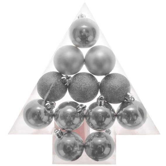 Zestaw bombek w świątecznym opakowaniu w kształcie choinki. Opakowanie transparentne umożliwiające zapoznanie się z produktem bez wyjmowania z pudełka. Zestaw zawiera trzy rodzaje bombek w kolorze srebrnym - gładkie, matowe oraz brokatowe. 12 sztuk w opakowaniu. Bombki o średnicy 4 cm.