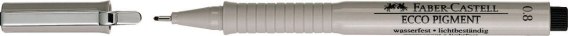 Cienkopis Ecco Pigment Faber-Castell w kolorze czarnym. Popularny i niezawodny, idealny do pisania, rysowania i szkicowania. Posiada pigmentowy i bezkwasowy tusz, wodoodporny i odporny na działanie światła. Długa i odporna końcówka fibrowa w metalowej obudowie dodaje precyzji we współpracy z szablonami i linijkami. Wyposażony w ergonomiczną strefę uchwytu i metalowy klips. Szerokość linii pisania 0,8 mm. Korpus i skuwka wykonane z materiału pochodzącego z recyklingu. Dostępne w 9 szerokościach linii: 0,05, 0,1, 0,2, 0,3, 0,4, 0,5, 0,6, 0,7, 0,8 mm w kolorze czarnym.