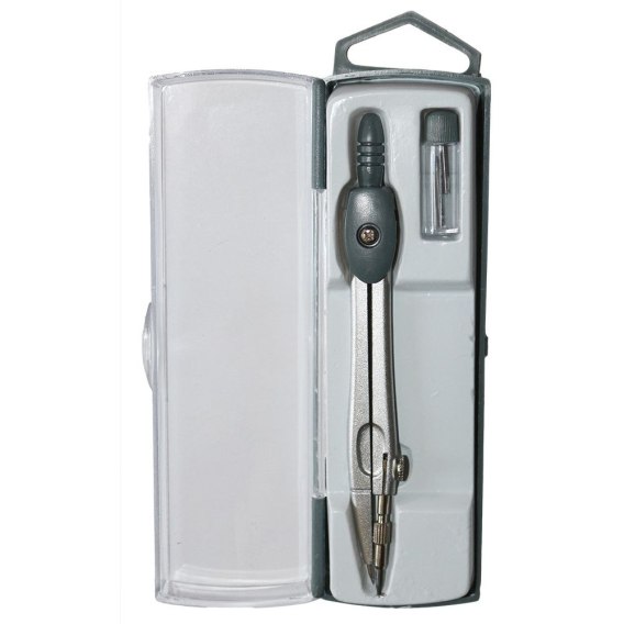 Dwuelementowy komplet geometryczny w plastikowym etui. Zestaw zawiera: cyrkiel oraz zapas grafitów