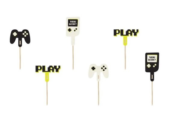 Dekoracje do muffinek - Gamer, zestaw zawiera 6 elementów (4 wzory), mix kolorów, wysokość ok. 6 - 10.5 cm. Produkt do samodzielnego złożenia. (1 op. / 6 szt.)