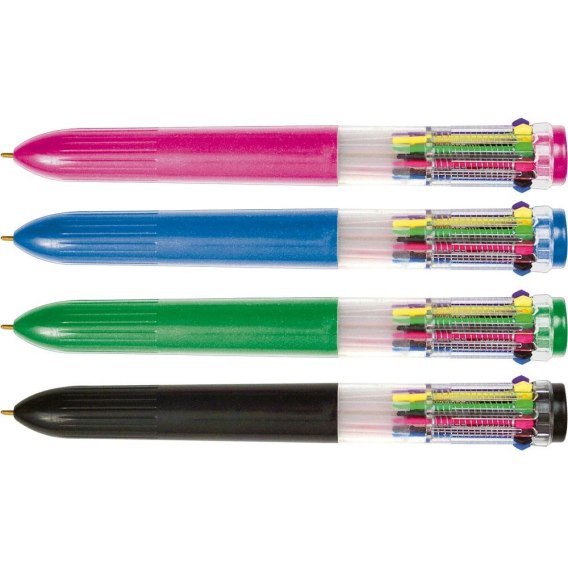 Automatyczny długopis, wielokolorowy. W jednej obudowie 10 kolorów wkładów. Grubość linii pisania: 0,7 mm. Mix kolorów obudowy (obecnie dostępny niebieski). Opakowanie: 12 szt.