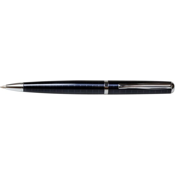 Długopis metalowy z delikatną krateczką na obudowie, wykończenie w kolorze srebrnym, obrotowy mechanizm wysuwania wkładu, wymienny wkład wielkopojemny w kolorze niebieskim. Grubość linii pisania 0,7 mm. Pakowany w woreczek foliowy