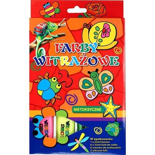 Zestaw farb witrażowych. Przeznaczone do dekoracji szkła, porcelany i tworzyw sztucznych. Zestaw zawiera: 1 czarny kontur 22 ml, 6 kolorów po 22 ml oraz arkusz z 6 wzorami + 2 arkusze folii.