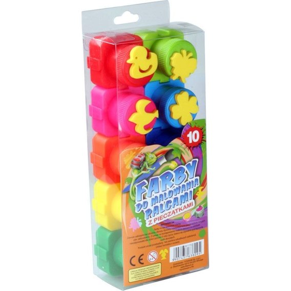 Gotowe do użycia farby do malowania palcami. Nie wymagają rozcieńczania z wodą. Zmywalne ze skóry i większości tkanin, nietoksyczne. Łatwo rozprowadzają się na różnych powierzchniach, pozostawiając żywe i trwałe kolory. Można je nanosić nie tylko palcami, ale również pędzlem lub gąbką. Ze śmiesznymi pieczątkami na zakrętkach pojemników. Podstawy pojemników wyposażone w zaczepy, pozwalające łączyć je ze sobą jak puzzle. Nowatorskie rozwiązanie pozwala na stworzenie stabilnej, zapobiegającej przewracaniu się palety farb w dowolnym kształcie. Idealne dla małych dzieci, np.: do robienia odbitek dłoni i stóp. Komplet zawiera 10 kolorów farb w pojemnikach o pojemności 15 ml.