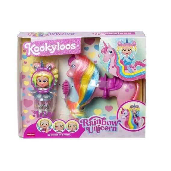 Czy wierzysz w jednorożce? W świecie KookyLoos wszystko jest możliwe! Odkryj Iris i jej jednorożca o imieniu Rainbow, którego grzywa jest wykonana z prawdziwych włosów! Rozczesz je szczotką i wypróbuj różne style. Przygotuj się na tysiące przygód z KookyLoos!