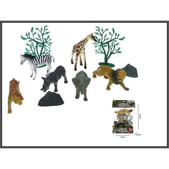 Zwierzęta dzikie 6szt. po około10cm : żyrafa , lew , zebra , tygrys , słoń i nosorożec. W zestawie również drzewka i kamienie.
