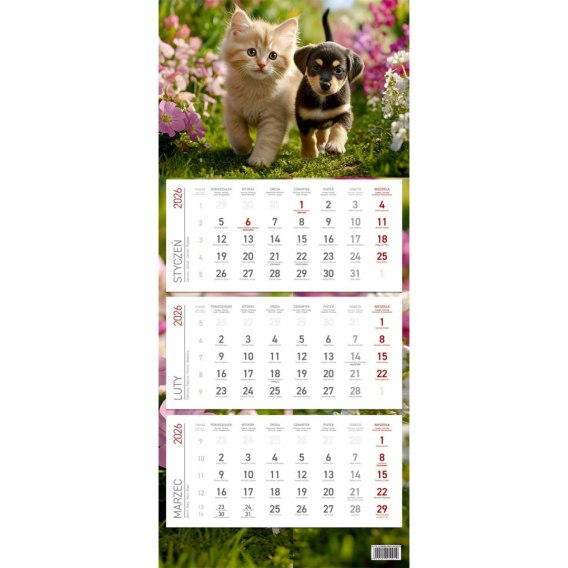 Kalendarz wiszący ścienny z kalendarium w układzie trójdzielnym, plecki i główka wykonane z jednego arkusza kartonu. Kalendarz składany do formatu A4.