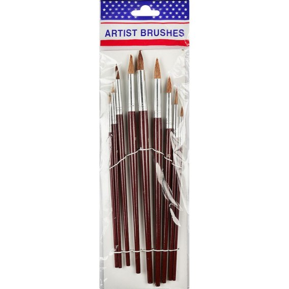 Pędzle artystyczne do farb akwarelowych z drewnianymi uchwytami w kolorze brązowym. Końcówka: stożkowa. Rodzaj włosia: kozie. W zestawie 9 sztuk pędzli, w rozmiarach: 0, 2, 4, 6, 8, 10, 12, 14, 16.