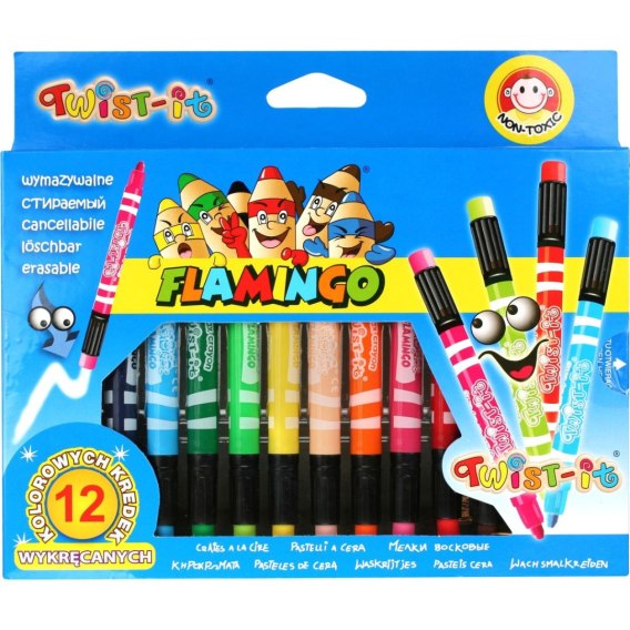 Kredki świecowe Twist-it Flamingo 12 kolorów wykręcane z gumką do wymazywania Flamingo