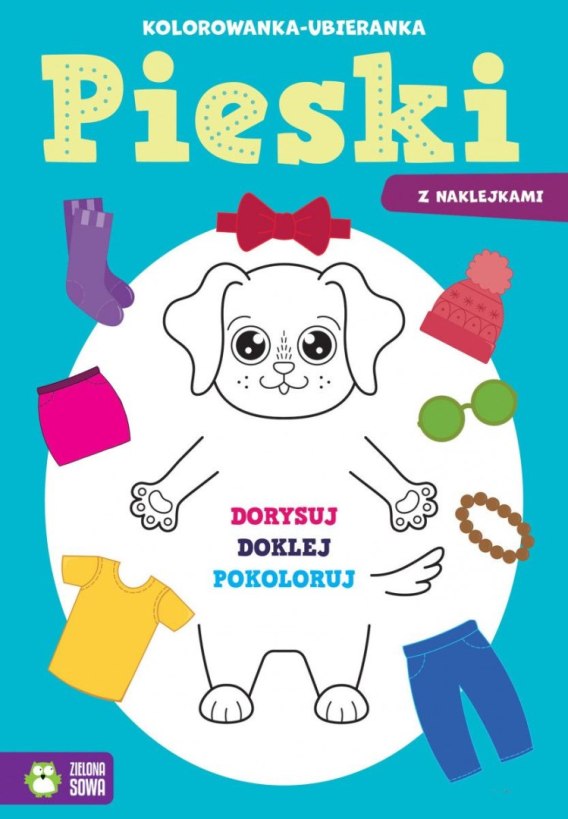 Wesołe kolorowanki z dodatkową aktywnością. Najpierw dziecko ma za zadanie dorysować zwierzątku ubranie, a następnie pokolorować ilustrację i ozdobić ją naklejkami.