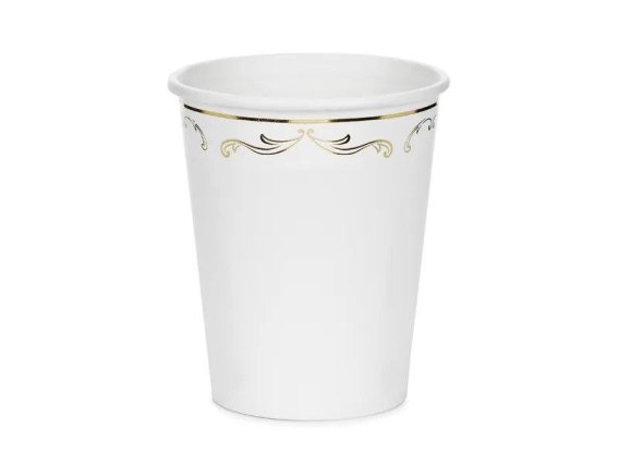 Kubeczki papierowe w kolorze białym ze złotym ornamentem. Wysokość ok. 9 cm, pojemność ok. 220 ml (7.4 oz). Produkt jednorazowego użytku. Nie używać do gorących napojów. Kubki na napoje zawierają oznaczenia wymagane przez Rozporządzenie wykonawcze Komisji (UE) 2020/2151 z dnia 17 grudnia 2020 r. ustanawiające zasady dotyczące zharmonizowanych specyfikacji w odniesieniu do oznakowania produktów jednorazowego użytku z tworzyw sztucznych wymienionych w części D załącznika do dyrektywy Parlamentu Europejskiego i Rady (UE) 2019/904 w sprawie zmniejszenia wpływu niektórych produktów z tworzyw sztucznych na środowisko. Produkt zawiera etykietę wyłącznie w języku polskim, niemieckim, czeskim, francuskim, niderlandzkim, słowackim, słoweńskim i bułgarskim.