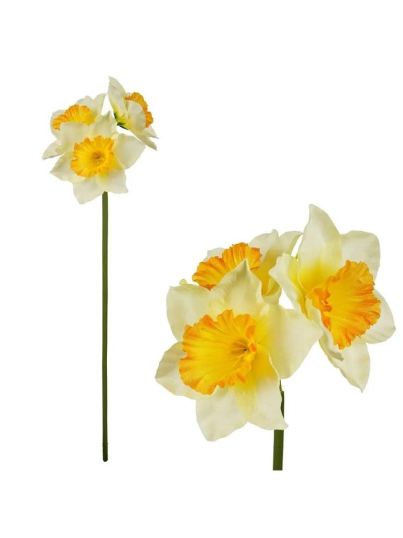Żonkile w formie bukieciku to klasyczna wiosenna dekoracja, która wiernie oddaje wygląd świeżych kwiatów i wprowadza do wnętrza radosny, słoneczny akcent. Delikatne, jasnożółte płatki z intensywnie żółtym środkiem nadają kompozycji naturalności i lekkości. Bukiecik doskonale sprawdzi się jako samodzielna ozdoba lub element większych aranżacji florystycznych, podkreślając wiosenny i wielkanocny charakter wystroju.