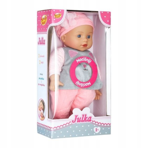 Interaktywna lalka Julka to uroczy bobas, który potrafi mówić, śpiewać i opowiadać bajki w dwóch językach - po polsku i po angielsku. Jej miękkie, przytulne ciało zachęca do noszenia i tulenia, a realistyczne rysy twarzy sprawiają, że wygląda jak prawdziwe niemowlę. Wystarczy nacisnąć brzuszek, aby usłyszeć jedną z wielu kwestii, piosenek lub bajek, co zapewnia dziecku nie tylko zabawę, ale i naukę nowych słów. Lalka ma na sobie różowo-szary strój z motywem kotka oraz czapeczkę z ozdobnym kwiatuszkiem, które nadają jej wyjątkowego uroku. Śpiewa trzy wesołe piosenki, opowiada dwie klasyczne bajki („Złotowłosa i trzy misie" oraz „Czerwony Kapturek") i zachęca do wspólnej zabawy, tańca czy ćwiczeń. Dzięki funkcji dwujęzycznej, maluchy mogą w naturalny sposób przyswajać podstawy języka angielskiego. Julka jest doskonałym wyborem na prezent dla dzieci od 2. roku życia. Rozwija wyobraźnię, uczy empatii i wspiera rozwój mowy, jednocześnie zapewniając godziny radosnej zabawy. W zestawie znajdują się baterie, dzięki czemu lalka jest gotowa do zabawy od razu po rozpakowaniu.