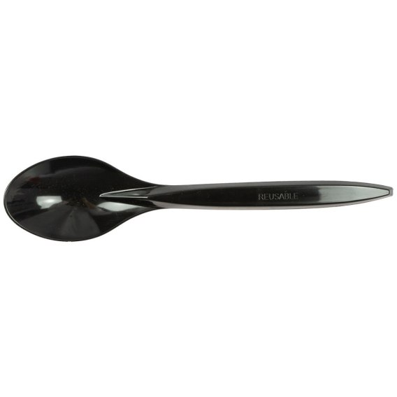 Łyżki wielorazowe wykonane z tworzywa w kolorze czarnym. Wytrzymałe a zarazem lekkie i wygodne sztućce wielokrotnego użytku.
