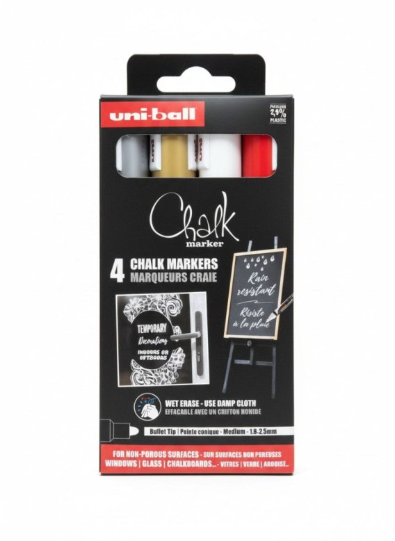 Zestaw 4 szt. markerów kredowych Chalk PWE-5M w kolorach: 2x biały, srebrny, złoty.