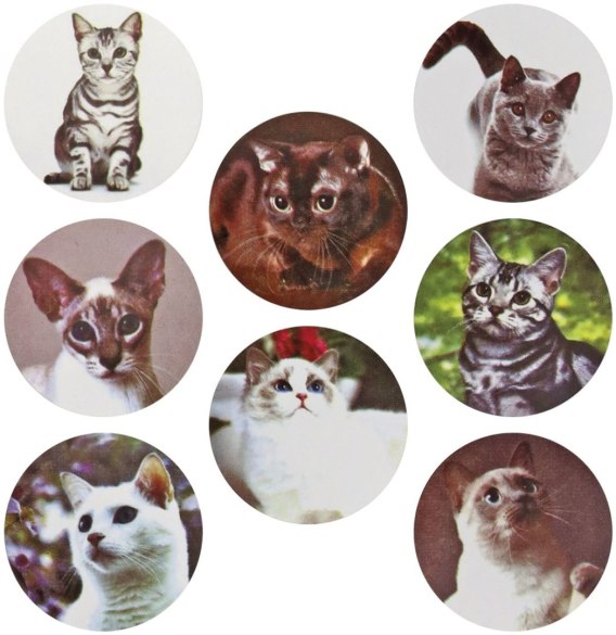 Naklejki papierowe na taśmie, 8 wzorów koty, średnica 25 mm, szerokość taśmy 28 mm, 500 sztuk.