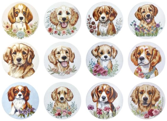 Naklejki papierowe na taśmie, 8 wzorów psy, średnica 25 mm, szerokość taśmy 27 mm. 500 sztuk.