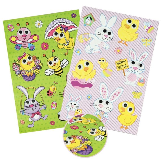 Zabawne naklejki wielkanocne na arkuszu o wymiarach 22x14 cm to kolorowa i oryginalna dekoracja. Ruszające się oczka dodają im unikalnego uroku, czyniąc je idealnym dodatkiem do kreatywnych prac plastycznych, takich jak ozdabianie kartek, koszyczków czy innych wielkanocnych kompozycji.
