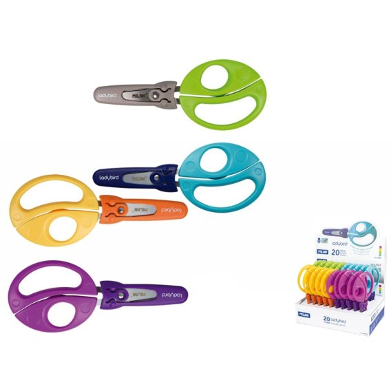 Nożyczki szkolne z osłonką na ostrze. Kształtem nawiązujące do biedronki. Ostrze ze stali nierdzewnej z zaokrągloną końcówką. Plastikowa ergonomiczna rączka. Długość 15 cm. Idealne do użytku szkolnego. Dostępne w 4 kolorach: żółtym, niebieskim, liliowym i zielonym. Oryginalny produkt stworzony przez własny dział badawczo-rozwojowy MILAN. Rozmiar nożyczek: 15 x 6,1 x 1,4 cm.