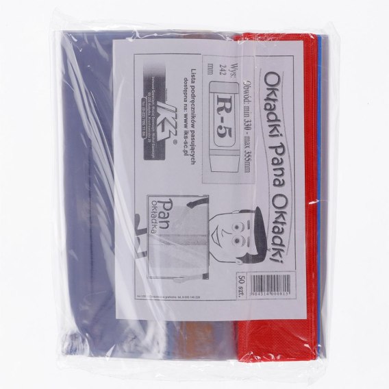 Okładki książkowe regulowane R-5 Wys. 242 mm obwód od 330 do 355 mm Wykonane z wysoko przeźroczystej folii o grubości 0,12 mm, paski w boczne 6 kolorach (mix). Opakowanie sprzedażowe zawiera 50 szt. Każda okładka z nadrukowanym kodem kreskowym