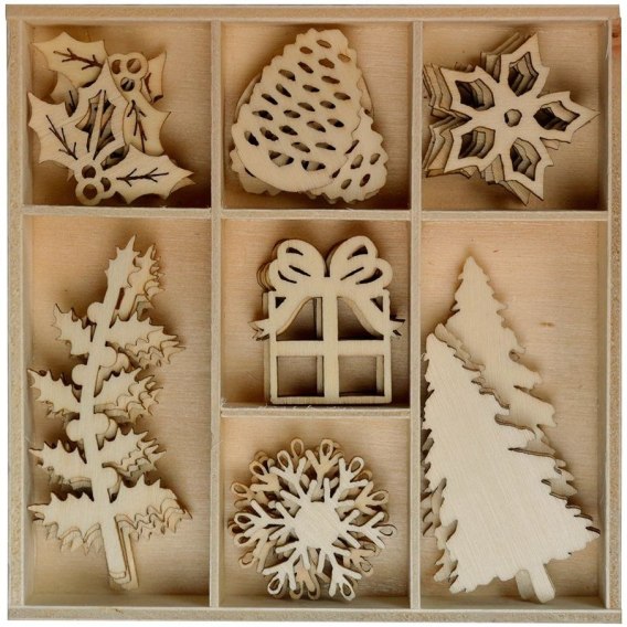 Drewniane elementy dekoracyjne świetnie nadają się do tworzenia zaproszeń, kartek okolicznościowych, pamiętników czy ozdób świątecznych. 9 wzorów w drewnianym pudełku o wymiarach 10,5 x 10,5 cm. Kształty: liść ostrokrzewu, szyszka, poinsecja, gałązka ostrokrzewu, prezent, płatek śniegu, choinka, kolor: naturalny. 40 szt.