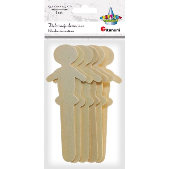 Drewniane patyczki z dekoracją, kształt: postać, wykonane z naturalnego drewna, można je dowolnie zdobić: malować, oklejać, lakierować. Wymiary: 47x134 mm. 6 szt.