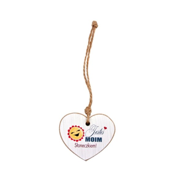 Dekoracja w kształcie serca 7,5x6,5cm z różnymi napisami do zawieszenia. Długość sznurka ok 14cm.