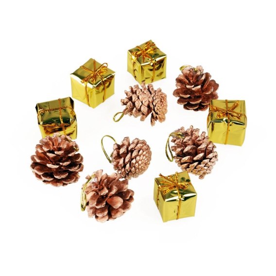 Zestaw ozdób do zawieszenia na choince. Wymiary szyszek: 3,5 cm, wymiar prezencików: 2,5x2,5x2,5 cm.