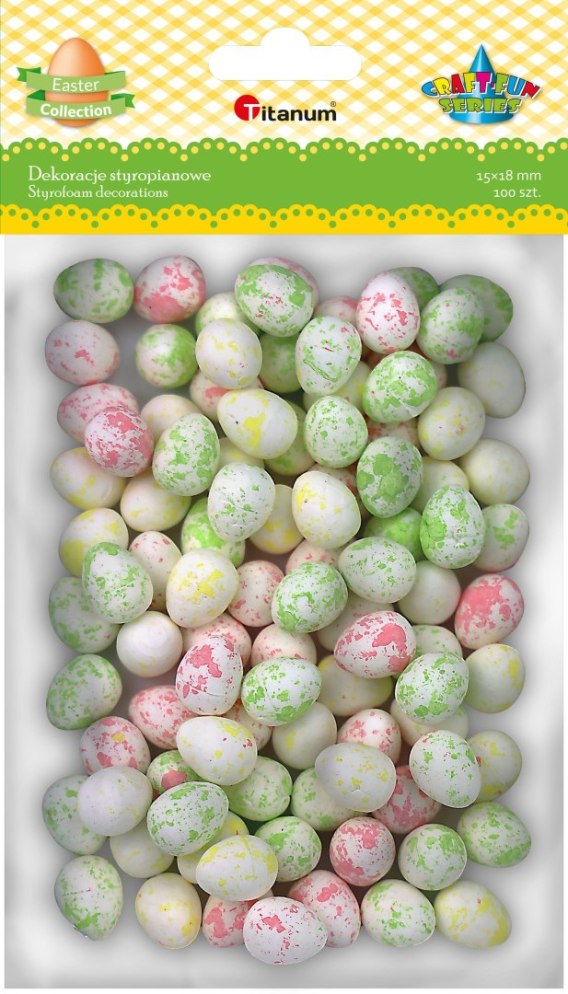 Jajka styropianowe 15 x 18 mm, nakrapiane, 3 kolory: zielone, żółte, różowe. 100 sztuk.
