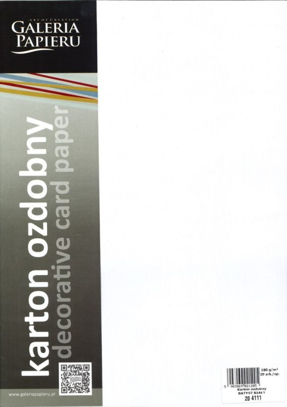 Karton ozdobny Batyst, metalizowany dwustronnie z tłoczeniem przypominającym tkaninę batystową, format: A4, gramatura: 220g/m2, ilość: 20 arkuszy w opakowaniu, kolor perłowej bieli, polecany do drukarek laserowych,