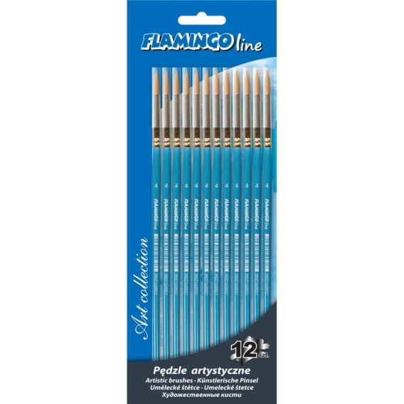 Pędzle artystyczne z włosiem syntetycznym. Wytrzymałe drewniane uchwyty w błękitnym kolorze, z oznaczeniem grubości pędzla. Sprawdzą się idealnie zarówno na zajęciach malowania farbami w szkole, jak i w domu. Rodzaj końcówki: okrągła. NR 4. Pakowane na blistrze po 12 sztuk.