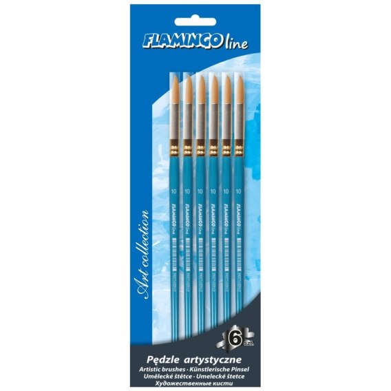 Pędzle artystyczne z włosiem syntetycznym. Wytrzymałe drewniane uchwyty w błękitnym kolorze, z oznaczeniem grubości pędzla. Sprawdzą się idealnie zarówno na zajęciach malowania farbami w szkole, jak i w domu. Rodzaj końcówki: okrągła. NR 10. Pakowane na blistrze po 6 sztuk.