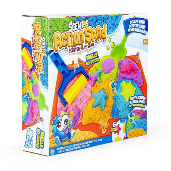 - w zestawie pachnący piasek kinetyczny w pięciu kolorach i 6 plastikowych foremek;