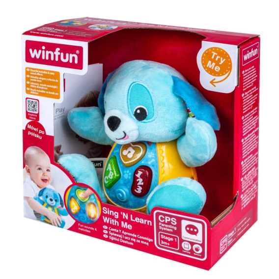 Na brzuszku posiada dwa świecące przyciski funkcyjne, po naciśnięciu których usłyszysz wesołe dźwięki i melodie. Twój maluszek z pewnością pokocha zabawę z pieskiem Szczekusiem.