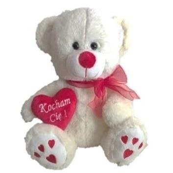 Biały miś z czerwonym sercem. Na sercu widnieje napisa "KOCHAM CIĘ"