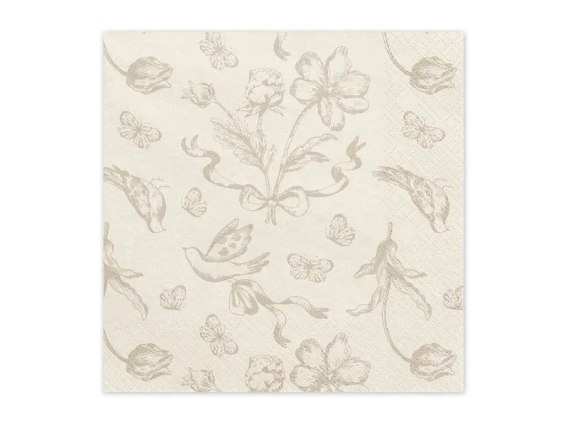 Papierowe serwetki w kolorze beżowym z ciemnobeżowymi kwiatami. Wymiary po rozłożeniu ok. 33 x 33 cm, wymiary po złożeniu ok. 16.5 x 16.5 cm.