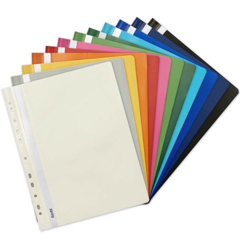 Klasyczne skoroszyty w formacie A4, wykonane z polipropylenowej folii. Przednia okładka o grubości 120 mic. jest przezroczysta dla doskonałej widoczności dokumentów. Tylna okładka o grubości 170 mic. została wykonana z nieprzezroczystej, jasnozielonej folii. Metalowe wąsy bezpiecznie mocują dokumenty w skoroszycie. Na grzbiecie znajduje się wymienny pasek do opisu zawartości. Uniwersalna perforacja umożliwia wpięcie skoroszytów do każdego segregatora.