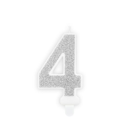 Świeczka urodzinowa Cyferka 4 w kolorze srebrnym, rozmiar ok. 7 cm.