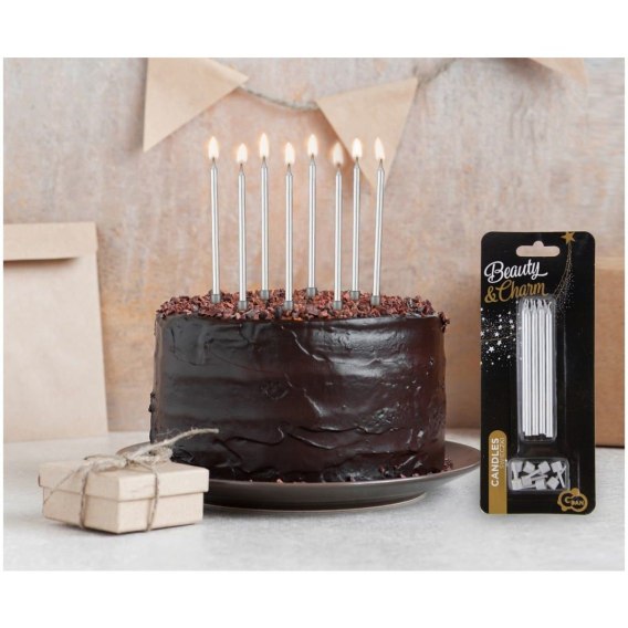 Świeczka urodzinowa srebrna z podstawkami 10 cm/ 8 sztuk