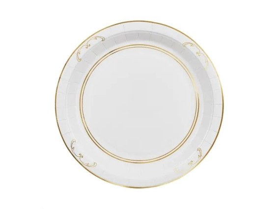 Talerzyki papierowe okrągłe w kolorze białym ze złotym ornamentem, średnica ok. 23 cm. (1 op. / 6 szt.)