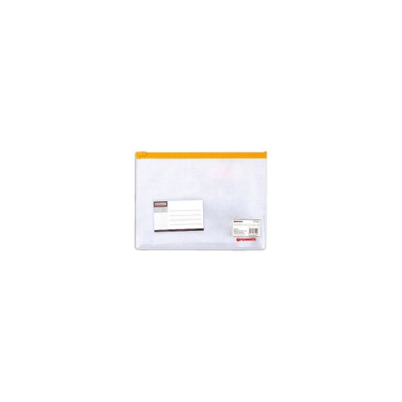 Koperta wykonana z przezroczystego PVC. Zamykana na zamek strunowy w kolorze żółtym. Wymiary: 238 x 173 mm, kieszeń na wizytówkę.