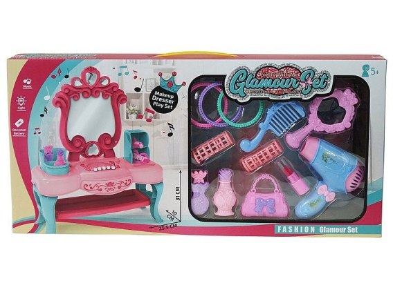 Zestaw toaletka, wymiary po rozłożeniu 25,5x31x10cm, światło, muzyka, z zestawem piękności; 52x25x7cm, W/B