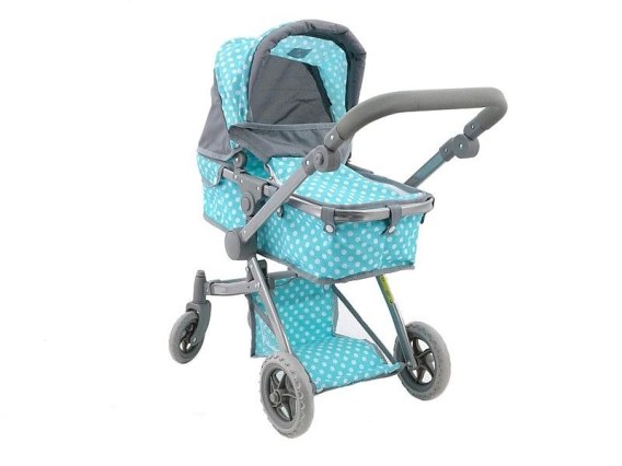 Wózek dla lalek, głęboki, obrotowe kółka, składany daszek, regulowana i przekładana rączka, z koszem, funkcja spacerówki, nosidełko, wymiary: 63x65x35cm, BOX