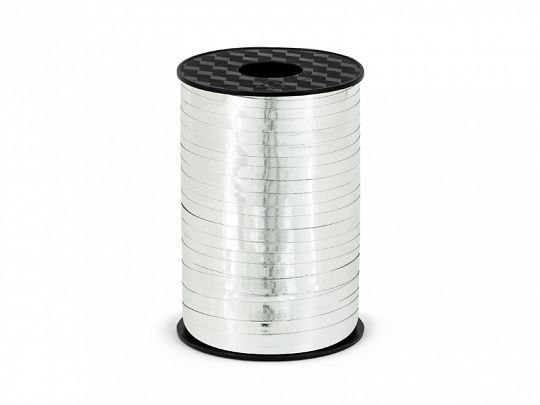 Wstążka plastikowa metalizowana w kolorze srebrnym, szerokość ok. 5 mm, długość ok. 225 m.