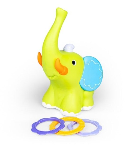 Razem ze Słonikiem ćwicz celność i przekonaj się czy jesteś zwinniejszy od niego! Zabawa polega na wrzuceniu wprost na słoniową trąbę kolorowych obręczy, które znajdują się w zestawie. Żeby nie było tak łatwo, cel jest ruchomy, gdyż słonik przemieszcza się, jeżdżąc we wszystkich kierunkach. Naciśnij na czapeczkę słonika, słuchaj piosenki w języku polskim i... trenuj rzuty!